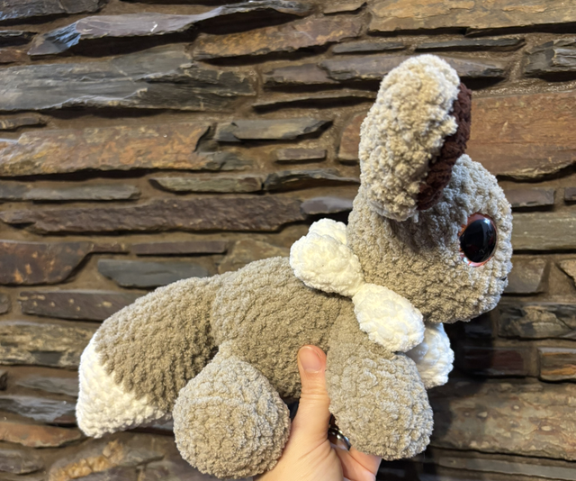 made using plush/blanket yarn, toy stuffing and safety eyes